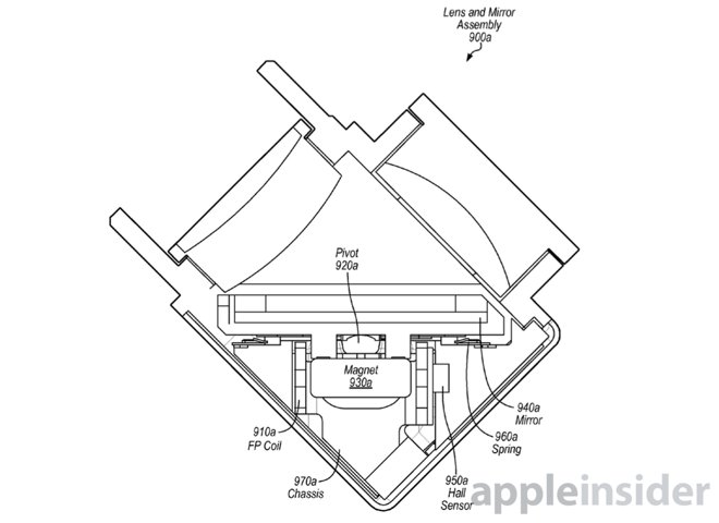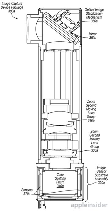 Světlo odražené od zrcadla následně směřuje do dalších modulů včetně optického zoomu a následně do čipu. Zajímavé je, že celá jednotka je opticky stabilizována a navíc umožňuje i v extrémně tenkém telefonu vytvořit optický zoom, který je doposud zcela zapovězeným tématem pro veškeré smartphony s výjimkou šíleností typu Galaxy zoom, což je však spíš fotoaparát, než telefon. Optický zoom totiž probíhá tím, že se přibližují a vzdalují skla objektivu, což v tenkém těle nebylo možné zajistit. Vše je extrémně jednoduché a zdá se, že se právě díváme na jeden z patentů, které by mohl Apple skutečně přivést k životu a použít.