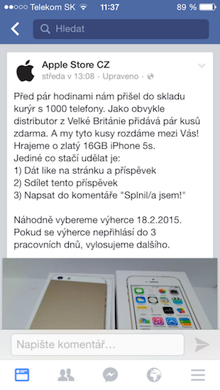 V posledních týdnech se na sociální síti Facebook objevil falešný profil Apple Store CZ, který lákal na soutěž o nové iPhony, které můžete vyhrát jen za to, že budete sdílet článek, budete jej lajkovat a něco napíšete do komentáře. Samozřejmě se ukázalo, že se jedná o totální nesmysl a stránka předtím, než měla vyhlásit vítěze zmizela. Objevila se však nová, aktuálně probíhá „soutěž“ na facebooku Apple Store SK, který byl založen okamžitě poté, co byl profil Apple Store CZ smazán.