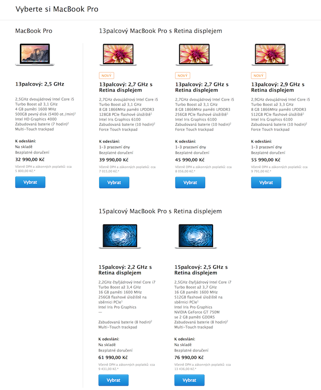 Apple dnes kromě novinek aktualizoval i svoje stávající počítače Mac. Ovšem kromě rychlejšího disku v MacBooku a nového trackpadu aktualizoval také své ceny ve svém Apple Online Storu. Ty však nikoho rozhodně nepotěší, jelikož rozdíl oproti cenám, které zde byli ještě před pár hodinami je opravdu více než znatelný. Například MacBook Pro s Retina displejem s 15″ uhlopříčkou stál ještě dnes 67 990 Kč, nyní stojí 76 990 Kč, což je přesně o 9000 Kč více a to je už opravdu znát. Tento model model navíc ani neprošel žádnou hardwarovou aktualizací a jediné, co bylo změněno je jeho cena.