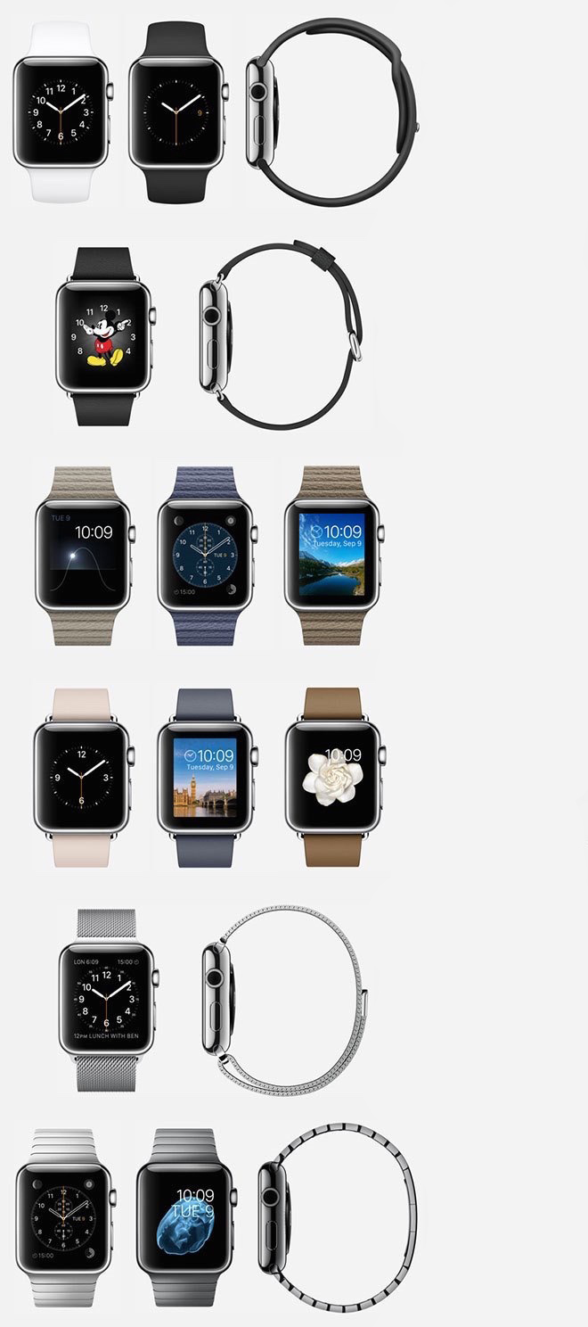 Na své si však přijdou i ti, co nechtějí za hodinky zaplatit velkou sumu, a tak si mohou zakoupit Apple Watch Sport, které jsou ze všech tří edicí ty nejlevnější, jelikož jejich cena začíná na $349 nebo dražší, ale stále ještě poměrně cenově dostupnou řadu Apple Watch, jejichž cena začíná na $549. Mezi Apple Watch Sport a Apple Watch je rozdíl zejména v použití materiálu jak u pásků, tak u samotných hodinek. Levnější Apple Watch Sport jsou vyrobeny z hliníku a dražší Apple Watch pak z nerezové oceli. Co se týče pásků, tak u levnějšího modelu lze použít pouze jednoduchý gumový pásek, který je ovšem na sportování z výběru nejlepší. U dražšího modelu Apple Watch je už nabídka pásků o něco bohatší. Kromě gumového je na výběr také kožený, který je barevně přizpůsoben jak pro potřeby můžů, tak i žen. Mezi nejdražší pásky v této řadě pak patří ty vyrobené z nerezové oceli, tedy ze stejného materiálu jako hodinky. Tyto pásky se pak liší pouze designem a zpracováním.