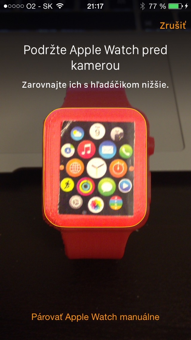 Proces párovania je skutočne zaujímavý a zároveň nám odhaľuje, akým spôsobom budeme párovať Watch a budúce wearable zariadenia s iPhonom (Google údajne zvažuje Android Wear pre iPhone). Po novom totiž stačí, aby ste pred seba položili hodinky a jednoducho namierili objektív iPhonu na ne. Fotoaparát teda deteguje hodinky podobným štýlom ako čiarové kódy a QR kódy pre Passbook alebo iné aplikácie, takže je možné že po prvom zapnutí na nich uvidíte QR kód, čiarový kód alebo kombináciu čísel. Ak však z nejakého dôvodu nechcete použiť fotoaparát, môžete zvoliť manuálne vyhľadanie hodiniek, ktoré funguje rovnakým štýlom ako pri hľadaní ostatného Bluetooth príslušenstva.