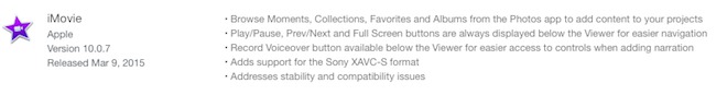 Aktualizace aplikace iMovie je dostupná skrz Mac App Store a má velikost 2 GB. Kromě výše zmíněné podpory Photos jsou novinkami také tlačítka sloužící pro zastavování, spouštění a pro posouvání videa, která se nyní zobrazují neustále pod videem, což má sloužit pro uživatele, aby se lépe v aplikaci orientoval. Vedle toho bylo přemístěno tlačítko pro nahrávání Voiceover, aby k němu měl uživatel lepší přístup. Drobnými novinkami je samozřejmě vylepšení stability a zlepšení kompability.