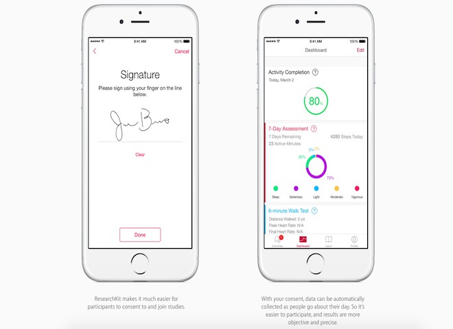 Všichni s telefonem všude chodíme, neustále ho používáme. Zařízení v roce 2015 jsou tak šikovná, že pomoc senzorů dokáží snímat různé informace. Právě ty chce Apple posbírat a odesílat je odborníkům a výzkumníkům, kteří si již s daty poradí. Se softwarem ResearchKit budou mít odborníci tedy možnost využít všechny funkce iPhonů pro své potřeby jako nikdy před tím. Do teď bylo otravné podílet se na výzkumu, muselo se dojít do nemocnice, vyplnit formuláře, člověk někdy ani nevěděl jak studie dopadla. S ResearchKit je to ale všechno jiné, stačí použít iPhone a ten se o vše postará, jelikož nepřetržitě snímá a monitoruje informace. Tento zdroj je neuvěřitelně hodnotný. Ba co víc, sbíráním dat se uživatel doví spoustu věcí o sobě, takže se dá předejít potencionálním problémům. Apple samozřejmě myslel i na soukromí, a tak se data budou sbírat jen po souhlasu uživatele, který bude muset podepsat kartičku v aplikaci Health.