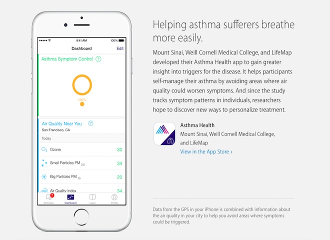 Příkladem může být aplikace Asthma Health od Weill Cornell Medical College, která pomocí monitorovaných dat dokáže určit, kde je špatné ovzduší, které může způsobit problémy lidem trpícím astma. Ti se těmto oblastem pak můžou vyhnout.