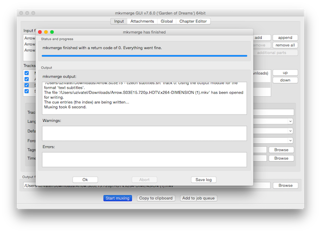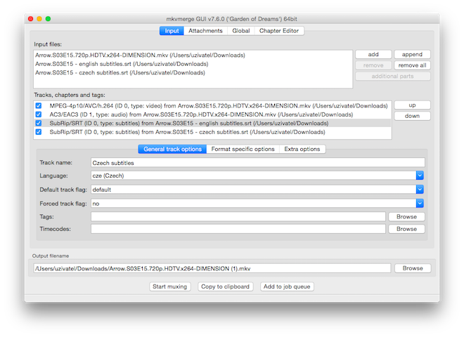 Pokud máte vše seřazené, pojmenované a ke všem stopám přiřazen jazyk, pak můžete kliknout na tlačítko Start muxing, které naleznete úplně dole, čímž vytvoříte cílený soubor s některou ze zmíněných přípon. Případně lze uložit právě vytvořený projekt do fronty pomocí tlačítka Add to job queue a začít s vytvářením dalšího, který opět přidáte do fronty. Tu pak vyvoláte klávesovou zkratkou Cmd (⌘) + J a spustít vše najednou. Celý proces trvá ve většině případů jen pouhých několik vteřin a vše je hotové. Defaultně se právě vytvořený soubor uloží na stejné místo jako první ze zdrojových, cestu však uvidíte také v řádku dole v okně programu.