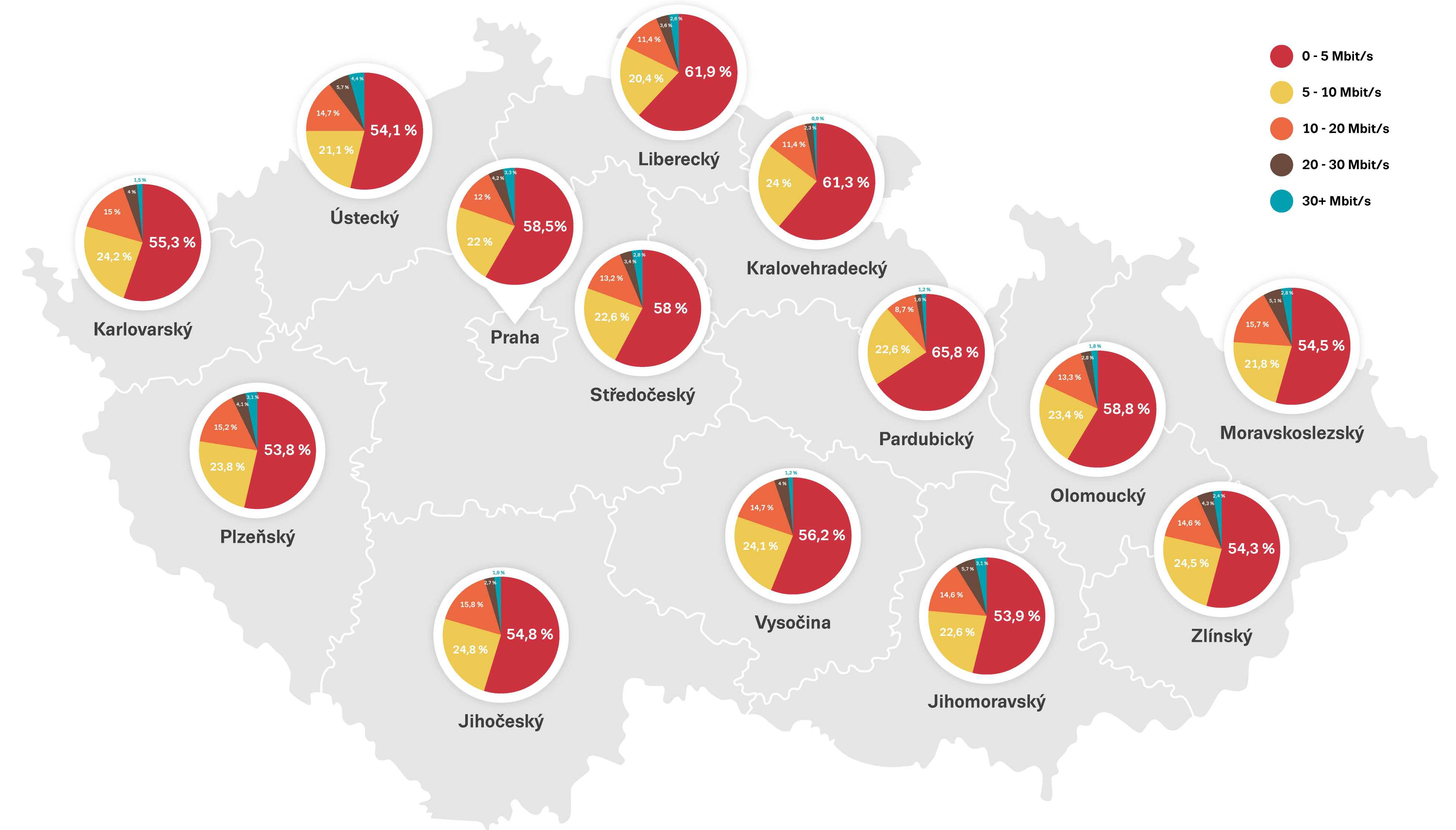 Server Seznam.cz dle svých měření dospěl k názoru, že většina domácností v České republice disponuje připojením do 5Mb/s, což je na dnešní poměry docela málo, ale na běžné prohlížení obsahu je to vcelku dostačující. Touto rychlostí jsou nejčastěji připojeny domácnosti v Pardubickém kraji a to konkrétně s 65,8% domácností připojených k internetu v tomto kraji. Na druhou stranu nejrychlejší internet nad 30 Mbit/s mají nejčasteji z celé České republicky v Ústeckém kraji, kde jej však má 4,4%. Zajímavá je také infromace, že cílem Evropské komise je do roku 2020 pokrýt 100% populace rychlostí minimálně 30 Mbit/s a 50% obyvatel pak alespoň 100 Mbit/s, tudíž se máme do pěti let dočkat celkem zajímavého progresu.