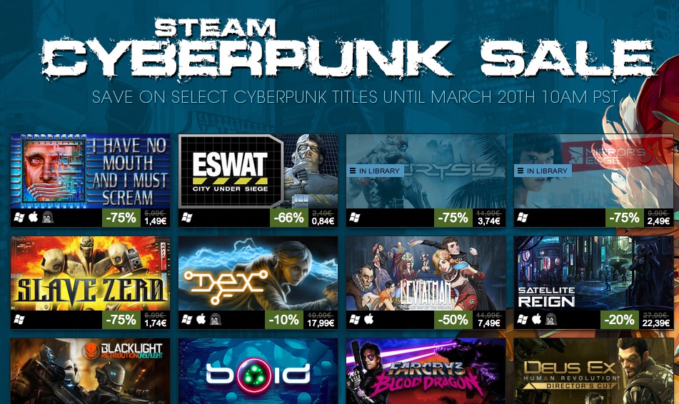 Valve celkom nečakane spustilo svoj Cyberpunk výpredaj, ktorý trvá až do 20. marca/března a môžete v ňom ušetriť slušné peniaze na hrách pre svoj Mac alebo Windows. Zrejme neprekvapí, že väčšina hier je kompatibilná len s konkurenčnou platformou a medzi takéto tituly patrí napríklad Crysis so 75% zľavou. Takto je zlacnených 39 titulov, z čoho len 19 je dostupných pre Mac a ide skôr o indie tituly ako o hry s „veľkými menami“. Za zmienku však stojí Deus Ex: Human Revolution v Director’s Cut edícii, ktorá je zlacnená na 4€ z pôvodných 20€ (80% zľava).