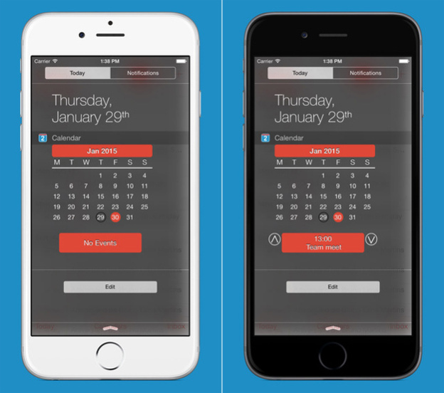Jednoduchý widget vašeho kalendáře do notifikačního centra do záložky Dnes. Na výběr je ze tří různých widgetů, z několika barevných provedení a jako pozadí si můžete přidat i vaši fotografii. Ve widgetu se zobrazují události, tudíž nemusíte otevírat aplikaci a stačí nahlédnout jen do záložky dnes.