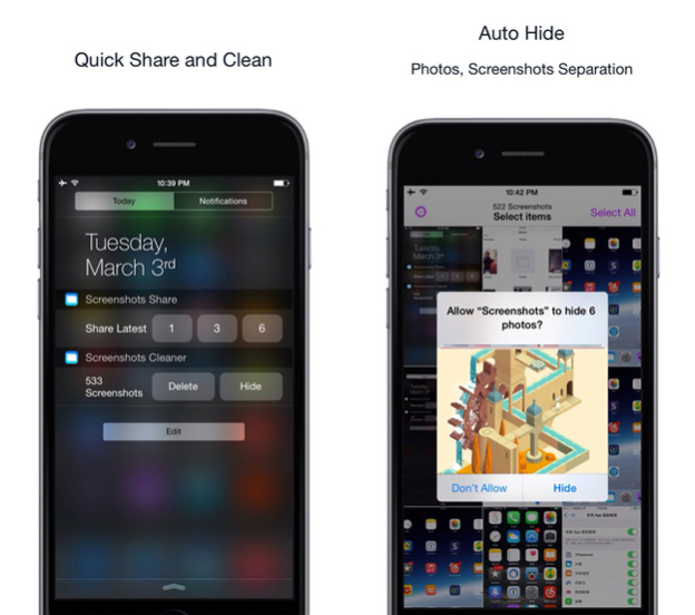 Jednoduchá aplikace, která nahrazuje trochu chybějící funkci v iOS. Automaticky rozpozná pořízené Screenshoty, zařadí je do samostatného alba pojmenovaného Screenshots a vybrané screenshoty můžete jednoduše sdílet dále. Do notifikačního centra si navíc můžete do záložky Dnes vložit dva widgety, kde máte možnost screenshoty smazat, skrýt a sdílet.