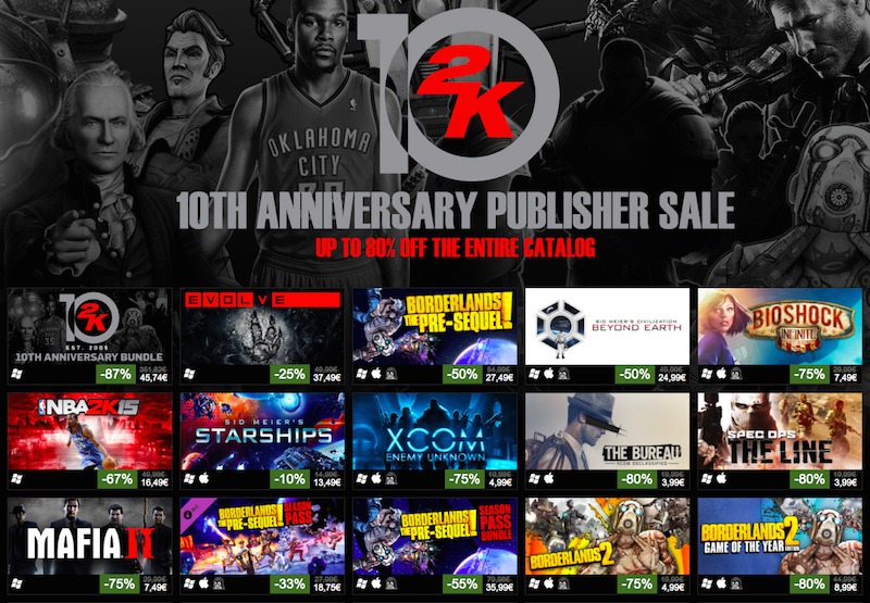Spoločnosť 2K Games, ktorá je vydavateľom mnohých známych hier nielen pre PC ale aj Mac, oslavuje 10. výročie od svojho vzniku. Spoločnosť sa to rozhodla osláviť veľmi príjemným spôsobom a spustila víkendový výpredaj na Steame s naozaj veľkými zľavami! Bavíme sa pritom o zlacnení na úrovni od 10 až po takmer 90% na 37 titulov a 1 celú kolekciu pre Windows. Práve tá bola zlacnená až o 87% a tak za necelé štyri desiatky hier zaplatíte len 45€ a nie 350€.