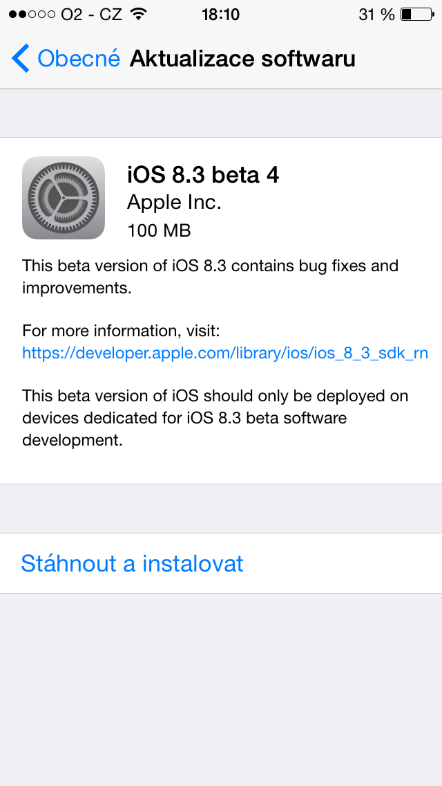 Apple práve rozposlal vývojárom štvrtú beta verziu operačného systému iOS 8.3. Nová beta vychádza dva týždne po tej predošlej a deň po vydaní novej beta verzie OS X Yosemite 10.10.3, ktorá je podstatne stabilnejšia, než predchádzajúca. Apple po boku vývojárskej verzie vydal aj druhú beta verziu pre užívateľov, ktorí sa rozhodli zapojiť do iOS Public Beta programu. V čase písania tohto článku ešte nie je známe, aké funkcie prináša nová beta, ale mohli by sme sa to dozvedieť čoskoro. Veľkosť aktualizácie sa líši v závislosti od zariadenia, na redakčnom iPhone 5 má veľkosť 100 MB.