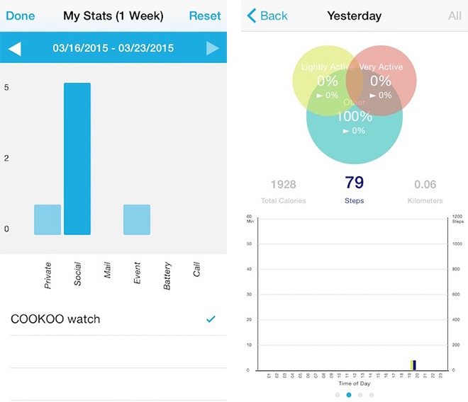 Kromě výše zmíněných funkcí jako vyhodnocení a zobrazení aktivity, a spuštění fotoaparátu pro pořizování fotografií pomocí hodinek, v aplikaci naleznete ještě další funkce jako statistiky notifikací, kde se ve sloupcovém grafu zobrazuje, na které notifikace jste byli upozorňováni nejčastěji. Samozřejmě v aplikaci najdete i možnost povypínat jednotlivé typy notifikací nebo vypnutí možnosti ovládat hudbu a nastavení příkazu pro spuštění funkce Find my Phone. Aplikace obsahuje i možnost nastavit si budík, kdy při jeho spuštění budete upozornění jak na mobilu, tak na samotných hodinkách. Stejně jako Find my Phone funguje i opačně funkce Find COOKOO watch, kdy na sebe hodinky začnou upozorňovat, abyste je našli.