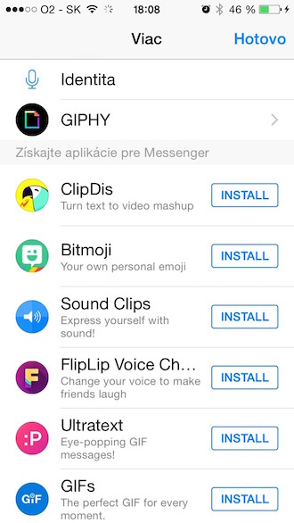 Facebook navyše oznámil, že pracuje s viac ako 40 vývojármi a prvé aplikácie pre Messenger sú už teraz dostupné. Medzi prvé patrí aplikácia Giphy, ktorú už teraz nájdete v App Store. Aplikácie môžu fungovať aj samostatne, po vybraní GIF animácie sa vám ale otvorí Messenger so zoznamom priateľov, ktorým môžete obrázok odoslať. Samotný obsah je následne viditeľný aj na počítači, ale možnosť posielať súbory podporuje len iOS. Ako navyše uviedol Facebook na svojej konferencii, všetky aplikácie vychádzajú už dnes spolu s novou aktualizáciou pre Messenger. Medzi prvé aplikácie potom patrí Giphy, ClipDis, Bitmoji, ESPN, Camoji, Talking Tom, Emu, ako aj aplikácie z dielne Zuckerbergovej spoločnosti – Stickered, Selfied, Shout.