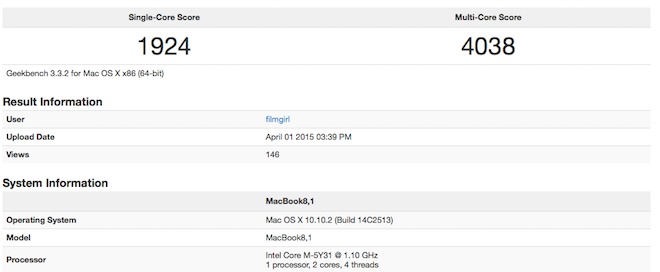 Testován byl základní model s 8 GB paměti RAM a procesorem Intel Core M-5Y31 o taktu 1,1 GHz. Testovány byly dokonce dva stejné typy a výsledky při single-core testu byly naměřeny 1924 a 2044, u multi-core pak 4038 a 4475. Jen pro srovnání, aktualizovaný MacBook Air z tohoto roku s procesorem Intel Core i5 o taktu 1,6 GHz získává průměrně okolo 2881 bodů při single-core testu a 5757 při multi-core testu, takže je o kousek výkonější, než nový MacBook s 12″ Retina displejem.