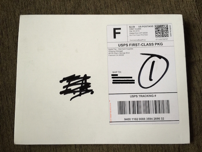 I my jsme samozřejmě neváhali a nálepky okamžitě objednali. Bohužel dodávka trvala poměrně dlouho, přesně 11 dní, což je na Apple opravdu dlouhá doba. Jestli byl problém u Applu, nebo u dodavatele USPS, nevím. Nálepky každopádně nakonec v pořádku dorazily v kartonové obálce. V té se po rozbalení nachází desky z kvalitního papíru, které jsou celé bílé, až na šedivé logo Applu v levém dolním rohu. Po otevření desek najdeme na levé straně návod, kam je nejlepší nálepky nalepit na skleněné dveře při vstupu do obchodu – nejvhodnější místo je to, kde jsou nálepky, které signalizují podporu různých kreditních karet. Ideální výška je podle Applu 50 palců (127 cm) od země. Na opačné straně stejného návodu je popsán postup, kam by se měly nalepit menší samolepky na registrační pokladnu či pás. Samozřejmostí je podrobné vysvětlení, jak samolepky správně nalepit.