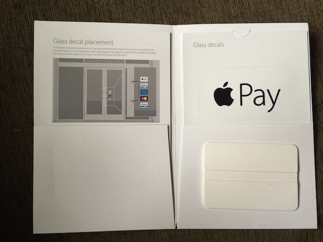 Samotné samolepky přicházejí ve čtyřech velikostech. Ty větší slouží pro nalepení na skleněné dveře a ty menší na registrační pokladnu. Obchodník si tak může vybrat tu správnou velikost. Kromě samolepek Apple k balení přidal i plastovou pomůcku, která slouží pro vyrovnání celého povrchu samolepky při nalepování na skleněné dveře. Nálepky jsou z kvalitního materiálu, aby vydržely veškeré podmínky. Celkově tak jde o jednoduché a stručné balení, které ale má velký potenciál. Fakt, že si uživatel po spatření těchto nálepek může být jistý, že v daném obchodě může platit pomocí Apple Pay, je velmi důležitý.