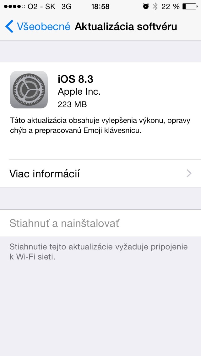 Ako sa dalo čakať, Apple dnes po boku operačného systému OS X 10.10.3 Yosemite vydal ďalšiu aktualizáciu, presnejšie iOS 8.3. Aktualizácia prichádza len mesiac po evente, na ktorom Apple oznámil detaily ku svojim hodinkám a zároveň predstavil niekoľko noviniek vrátane revolučného ResearchKit rozhrania. Najnovšia softvérová aktualizácia má veľkosť približne 220 MB, no líši sa v závislosti od zariadenia. Na iPhone 5c má veľkosť 223 MB a jednou z „najdôležitejších“ funkcií v tomto update je podpora viac ako 300 nových Emoji znakov, kvôli ktorým bola tiež upravená Emoji klávesnica. Klávesnica na iPhone 6 Plus bola tiež upravená, teraz ponúka tlačidlá Kurzíva a Podčiarknuť pri používaní v režime na šírku.