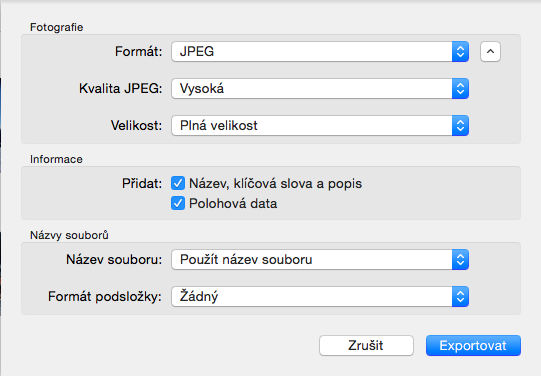 Další možností je využít export, který nabízí přímo aplikace Photos. Označíte si fotografie a nahoře zvolíte Soubor –> Exportovat –> Exportovat fotografie… a následně si zvolíte, v jakém formátu se mají fotografie exportovat, jakou mají mít kvalitu a velikost, jaká data mají obsahovat a jestli se mají vložit do podsložky okamžiku. Po potvrzení toho všeho si zvolíte umístění exportu a je to. Tento proces je poněkud zdlouhavější, než výše popsaný, avšak nabízí mnohem více možností.