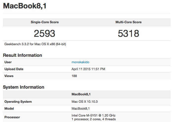 Nový MacBook je už v predaji a ako je známe, nateraz sú k dispozícii dve hardvérové revízie počítaču. Tá výkonnejšia disponuje procesorom Intel Core M s frekvenciou 1.2 GHz. Po boku procesoru, ktorý je výkonnejší o 100 MHz, sú však ostatné aspekty hardvéru rovnaké ako pri lacnejšom modeli a teda vnútri nájdeme grafiku Intel HD 5300 a 8 GB RAM. Zmena oproti základnému modelu teda nie je nejaká drastická, no v benchmarkoch sa odrazí na vyššom skóre. To je vyššie o približne 200 bodov v single-core teste a o 850 bodov pri multi-core teste, vďaka čomu má MacBook skóre 5 318 bodov v multiscore teste.