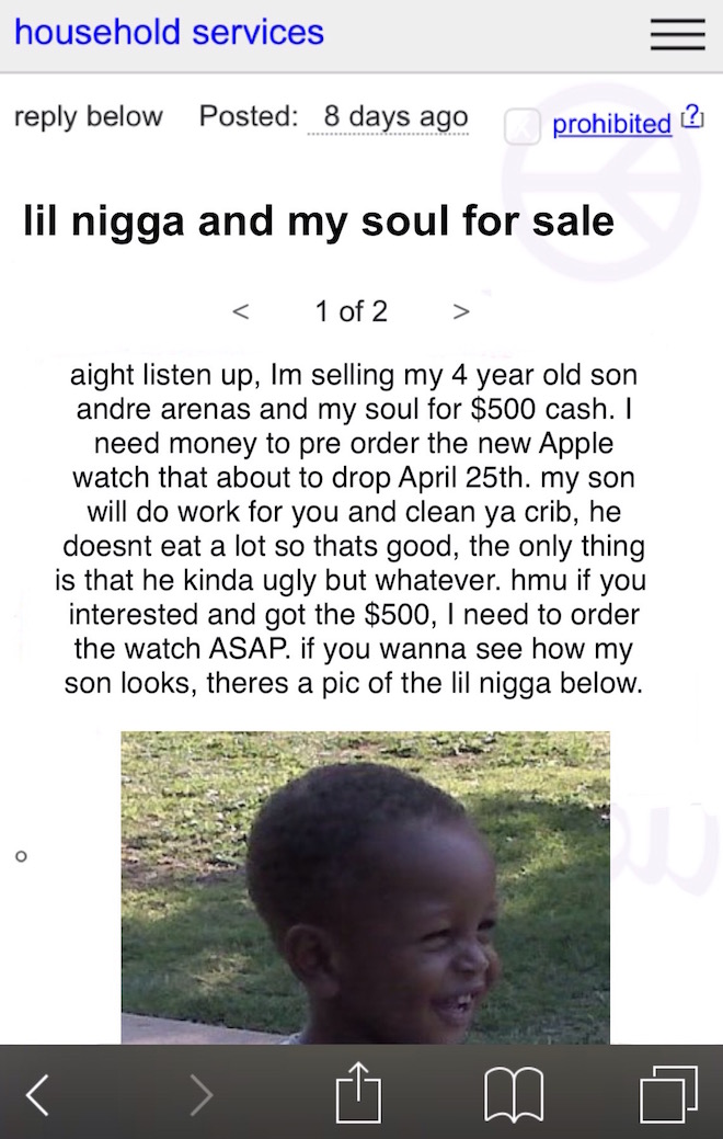 Ledviny a jiné orgány se prodávaly kvůli financím na nákup produktů Applu už v době druhého iPadu (Čínský teenager prodal ledvinu aby si koupil iPad!) a když už o orgány není zájem, přišel 22 letý Američan Jason Arenas s nabídkou, která se neodmítá. Na Craiglist totiž přidal syna, za kterého chtěl 500$ a navíc jako bonus přihodil vlastní duši. Jak sám Jason uvedl, za peníze si chtěl koupit Apple Watch.