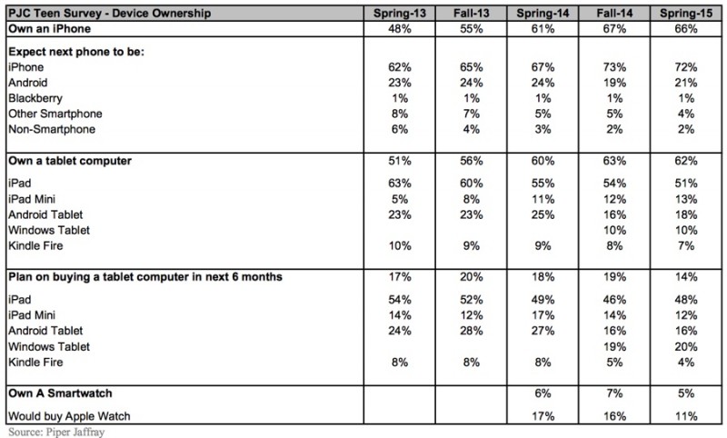 Vyzerá to teda, že ešte potrvá nejaký čas, kým sa teenageri stanú jednou z hlavných vekových kategórií zákazníkov pre Apple Watch. Nateraz musí byť Apple spokojný s tým, že iPhone a iPad sú najobľúbenejšie produkty medzi teenagermi. Až 66% opýtaných vlastní iPhone a až 64% vlastní iPad. Z toho až 60% očakáva, že ich budúcim tabletom bude iPad a 70% očakáva, že sa v budúcnosti stanú majiteľmi iPhonu. Počet ľudí, ktorí preferujú Android, je nižší – 21% očakáva telefón s Androidom a 16% očakáva tablet s Androidom. Prekvapivo však až 20% očakáva, že ich budúci tablet bude disponovať operačným systémom Windows. Prieskumu sa zúčastnilo približne 6 200 teenagerov v USA.