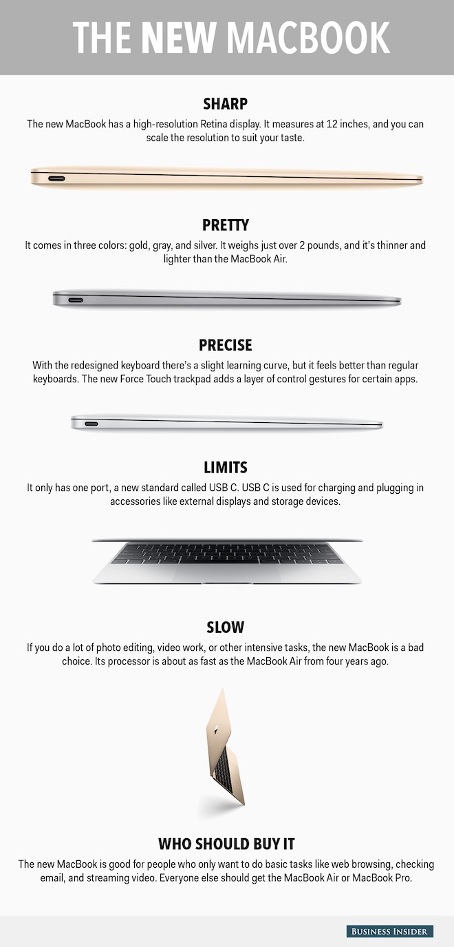 V novej infografike, ktorú v týchto dňoch zverejnil server Business Insider sa môžeme dočítať, že novinka je prakticky plná kompromisov. Áno síce ponúka krásne tenké telo s dokonalým displejom, avšak toto sa istým spôsobom negatívne odrazilo na jeho výkone a výdrži. V tejto infografike sa môžete dočítať o silných a slabých stránkach tohto MacBooku. Medzi silné nepochybne patrí už zmieňovaný dizajn, displej a precíznosť spracovania. No na druhú stranu slabými stránkami sú nepochybne nie príliš oslnivý výkon, jediný USB C port, ktorý sa na ňom nachádza, no a v neposlednom rade jeho cena. Veď názor si každý z Vás určite dokáže urobiť sám.