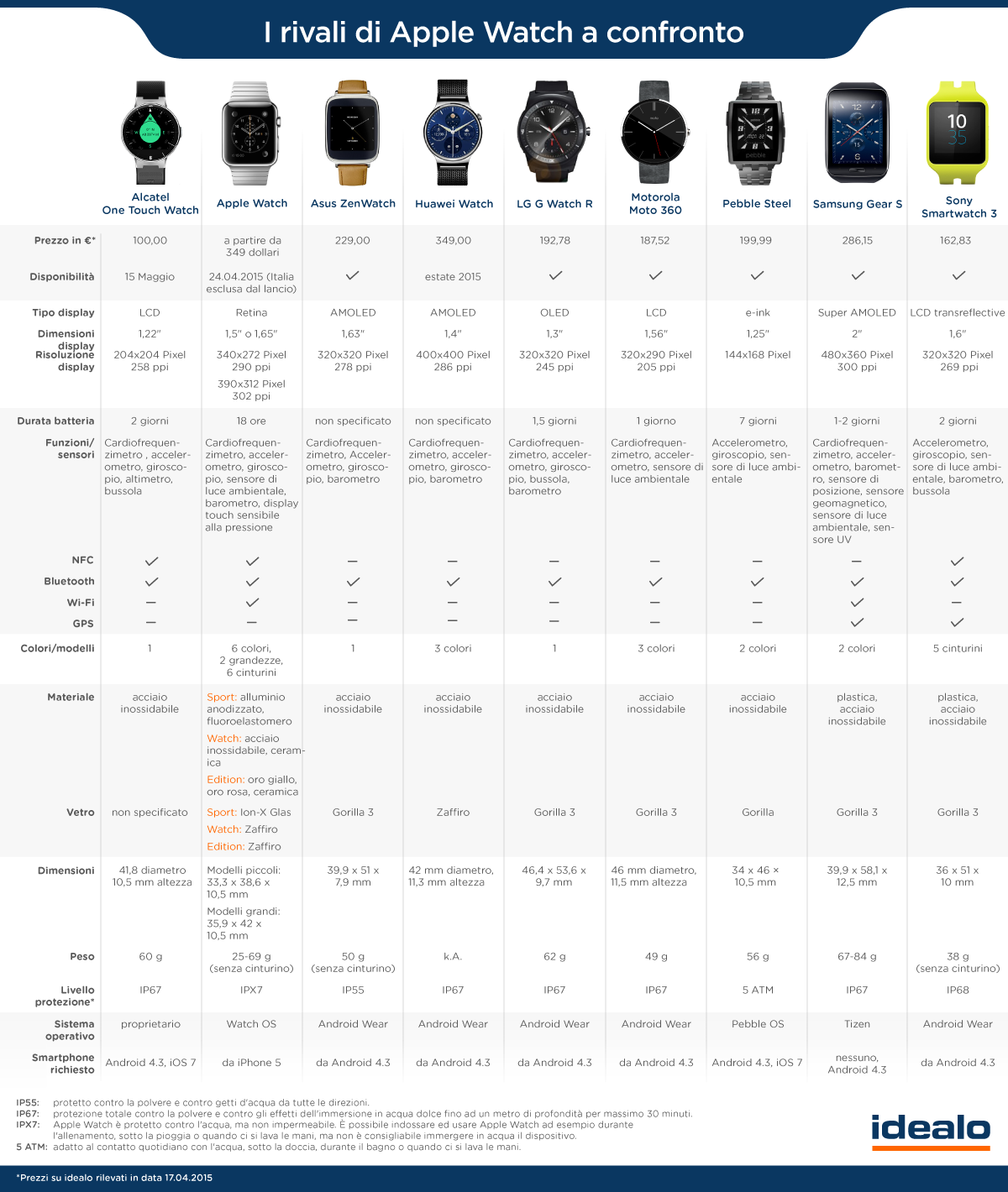 Brzy by však podle zpráv měl Google vydat aplikaci Android Wear pro iOS, která by zajistila komunikaci jablečného mobilního systému se smartwatch, které mají systém Android Wear. Brány se tedy otevřou mnohým z nás, kteří by raději než Apple Watch například Huawei Watch nebo třeba Motorola Moto 360. Pokud ale po nějakých hodinkách pokukujete a nejste si jisti, které vlastně doopravdy chcete, pak vám můžte pomoci následující srovnání všech zajímavých smartwatch od všech významných společností na trhu. Naleznete zde Alcatel One Touch Watch, Asus ZenWatch, Huawei Watch, LG G Watch R, Motorola Moto 360, Pebble Steel, Samsung Gear S, Sony SmartWatch 3 a nakonec samozřejmě samotné Apple Watch.