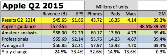 Podobne ako v minulosti, tak aj teraz Fortune zozbieral predpovede analytikov týkajúce sa oznámenia finančných výsledkov za uplynulý kvartál. Podľa analytikov to vyzerá, že Apple teraz čaká veľmi veľký nárast oproti minulému roku, na čom sa zhodujú nielen profesionáli, ale aj začínajúci analytici figurujúci na Wall Street. Obe skupiny totiž očakávajú takmer 25-percentný nárast tržieb oproti minulému roku. To zahŕňa aj nárast predajov iPhonu oproti minulému roku o 32,6% a Macov o 13,6%. Naopak pri tabletoch iPad sa očakáva ďalší pokles, teraz o 14,9%.