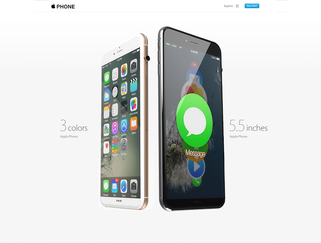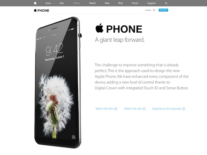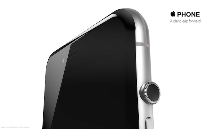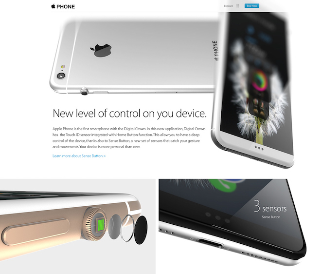 Tlačidlo bolo teraz presunuté na pravý bok, nad Power Button. Okrem toho, že sa jedná vlastne o digitálnu korunku, disponuje tlačidlom Touch ID. Pod obrazovkou sa nachádzajú tri bodky a jedná sa o tzv. Sense oblasť, ktorá sníma rôzne gestá a pohyby, podobne ako to už pár rokov dokážu telefóny s Androidom. Vývojár ďalej prezentuje, že telefón bude len v 5.5-palcovej verzii a v troch farebných variantoch, medzi ktorými nechýba ani Rose Gold farba. Telefón by mal ďalej QHD displej s rozlíšením 2560 x 1440 pixelov a vo vnútri nájdeme pre zmenu procesor Apple A9 a koprocesor M9. Nakoniec, hrúbka by bola 6,9 milimetra.