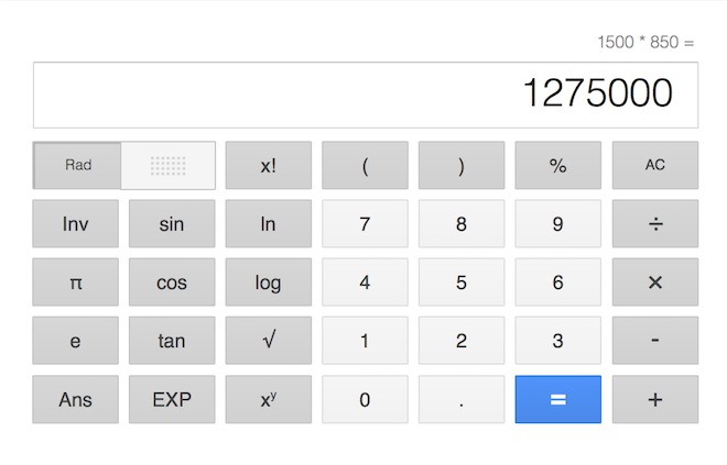 Google má ďalšiu skvelú možnosť, ktorá umožní vypočítať si určitý matematický úkon priamo z vyhľadávača. Stačí ak tam zadáte nejaký jednoduchší príklad a hneď dostanete výsledok. Napríklad: „1500*850“.