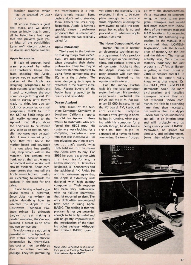 „Steve Jobs byl ten, kdo mluvil. Po obědě jsme jeli k jeho rodičům v Palo Alto – nikdy jsme nešli dovnitř – ale pouze do garáže. Na lavičce se nacházela základni počitačová deska. Nad ní byla polička, kde ležel televizní set, ze kterého vedly kabely do té počítačové desky. Steve Jobs mluvil celou dobu, pořád vysvětloval a popisoval budoucí plány pro marketing a vývoj, skoro při tom tancoval na špičkách svých tenisek. Woz seděl na lavičce a spouštěl operační systém, aby mi ukázal program. Woz byl docela tichý. Došlo mi, že právě on je inženýrem a že Jobs je spíše mozkem celého projektu. Jobs také řekl, že se Apple zaměřuje na to, aby Apple byl v každé učebně a na každém stolu, protože by si tak děti tyto produkty oblíbily už od samého začátku, což by znamenalo, že se k Applu vrátí, stejně jako jejich děti. Tyto počítače by byly školám darovány. S postupem času jsem pochopila, že když jsem ten článek vydala, Apple začal získávat spoustu objednávek a nebyl pochyb o tom, že to Apple myslí opravdu vážně a že se s nim musí počítat.”