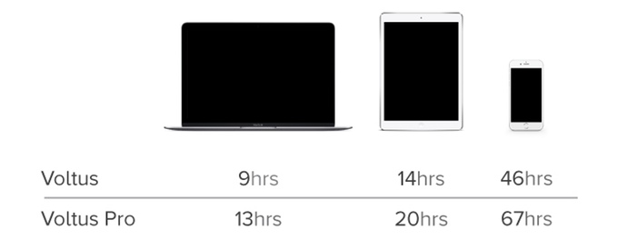 Voltus je elegantní zařízení, které je k dispozici buď v základní verzi nebo ve verzi Voltus Pro. Rozdíl mezi nimi je, že zatím co klasická verze rozšíří výdrž MacBooku o 9 hodin, iPadu o 14 hodin a iPhone až o 46 hodin a nabití samotné baterie trvá 5 hodin, verze Voluts Pro dokáže prodloužit výdrž MacBooku o 14 hodin, iPadu o 20a iPhonu dokonce o 67 hodin. Nabití samotného Voltus Pro pak trvá 7,5 hodiny.