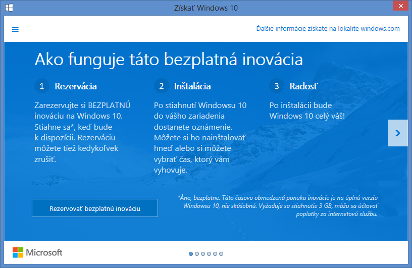 Ten nesie pomenovanie Windows 10 a symbolizuje novú éru systému Windows, vďaka čomu je možné, že o niekoľko rokov o ňom budeme počuť už len ako o systéme „Windows“, bez akéhokoľvek iného označenia. Samotný systém bude dostupný až do 29.7.2016 úplne zadarmo pre všetkých, ktorí sa rozhodnú upgradovať z Windows 7 alebo Windows 8(.1) a aby Microsoft uvedomil verejnosť o tomto kroku, rozhodol sa upozorniť užívateľov priamo v systéme. V priebehu týchto dní sa totiž na obrazovke počítačov môže objaviť informatívne okno, ktoré umožňuje užívateľom, aby si rezervovali svoj update. Microsoft v tomto okne popisuje kľúčové novinky a zrejme nikoho neprekvapí, že prvá novinka sa týka návratu tradičného Štart Menu v modernizovanej podobe. Okrem možnosti rezervovať si bezplatný upgrade je tu možnosť nechať sa kontaktovať e-mailom v momente, kedy bude vaša licencia pripravená na inštaláciu. Zaregistrovaným užívateľom sa tiež v čase vydania začne sťahovať aktualizácia, u ktorej si môžu následne zvoliť, kedy ju chcú nainštalovať.