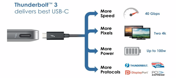Prenos dát cez USB-C konektor nemá žiadny vplyv na rýchlosť a Thunderbolt 3 dokáže prenášať dáta naďalej rýchlosťou až 40 Gbps. Miniatúrny port je naozaj multifunkčný a spĺňa všetko to, prečo sa ho Intel rozhodol použiť ako štandard u najnovšej technológie. Dokáže totiž prenášať energiu, dáta a aj obraz pomocou jediného portu. Vďaka Intelu tak môžeme čakať, že už budúcoročná generácia MacBookov ponúkne tenšie telo a pritom rovnaký alebo vyšší výkon. Navyše, technológia je plne pripravená pre profesionálov, vďaka technológii je možné používať naraz dva 4K monitory pri 60 Hz. Technológia je samozrejme spätne kompatibilná so súčasnými Thunderbolt 2 zariadeniami, takže profesionálom stačí využiť redukciu, prípadne novší kábel. Intel nakoniec vraví, že prvé zariadenia s Thunderbolt 3 technológiou sa začnú predávať už koncom roka a preto je možné, že sa tento rok dočkáme aktualizácie Mac Pro, ktorý nahradí súčasné porty novými a tiež sa môže do obehu dostať nová generácia iMacov s novým portom.