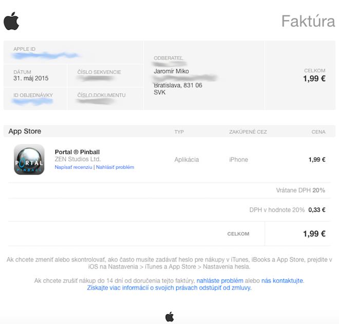 Spoločnosť Apple učinila ďalší zaujímavý krok, ktorý sa opäť zameriava na App Store. Spoločnosť už pred týždňom aktualizovala svoje obchody a obohatila ich o slovenskú a českú lokalizáciu, a najnovšie spravila to isté aj s faktúrami, ktoré vám posiela na e-mailovú adresu po dokončení nákupu v niektorom zo svojich obchodov. Okrem kompletne preloženej faktúry však Apple doplnil faktúry o ďalšie pole, v ktorom spomína typ zariadenia, z ktorého bola daná aplikácia, hudba, film alebo kniha kúpená.