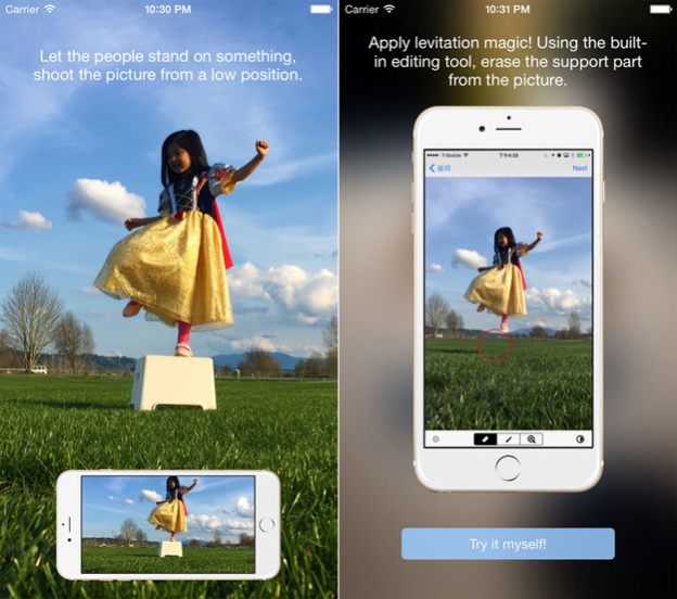Levitagram je aplikace sloužíci k úpravě fotografií. Kromě ostatních však umí několik funkcí jako třeba odstranit na fotografii něco, co tam nechcete. Aplikace byla dobře ohodnocena mnoha zahraničními weby a stala se velice oblíbenou.