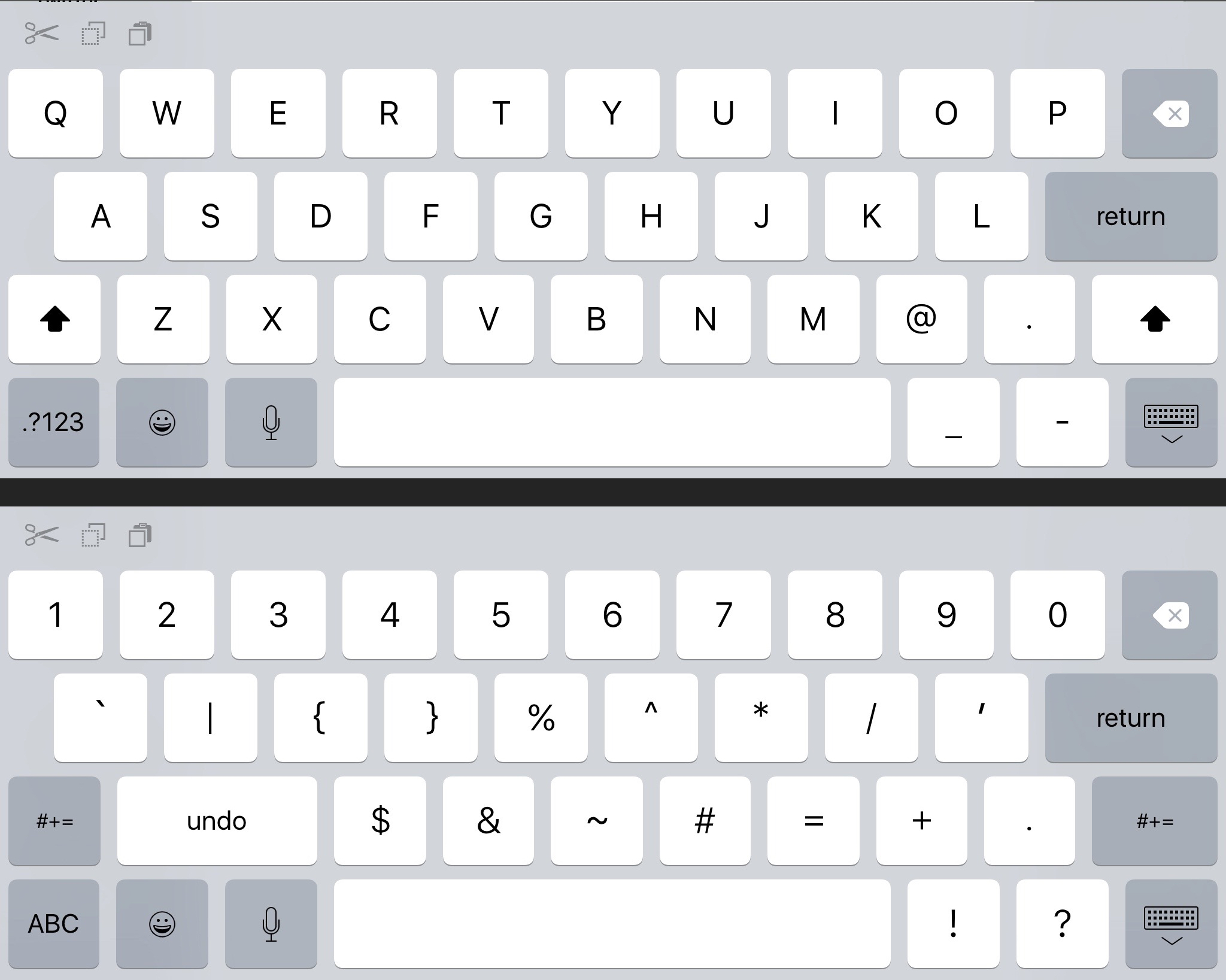 Jak můžete vidět na snímcích níže, klávesnice se snaží využít větší prostoru iPadu tím, že přidává klávesy jako je Tab a Caps Lock na levou stranu. Novinkou je také horní řádek symbolů. Symboly jsou přitom stejné, jako ty, které najdeme na horní řádce klávesnice u MacBooku společně s čísly, tedy: @ # $% ^ & * () _ +. Vedle klávesy p přibyly složené závorky a také klávesa pro napsání svislé čáry.