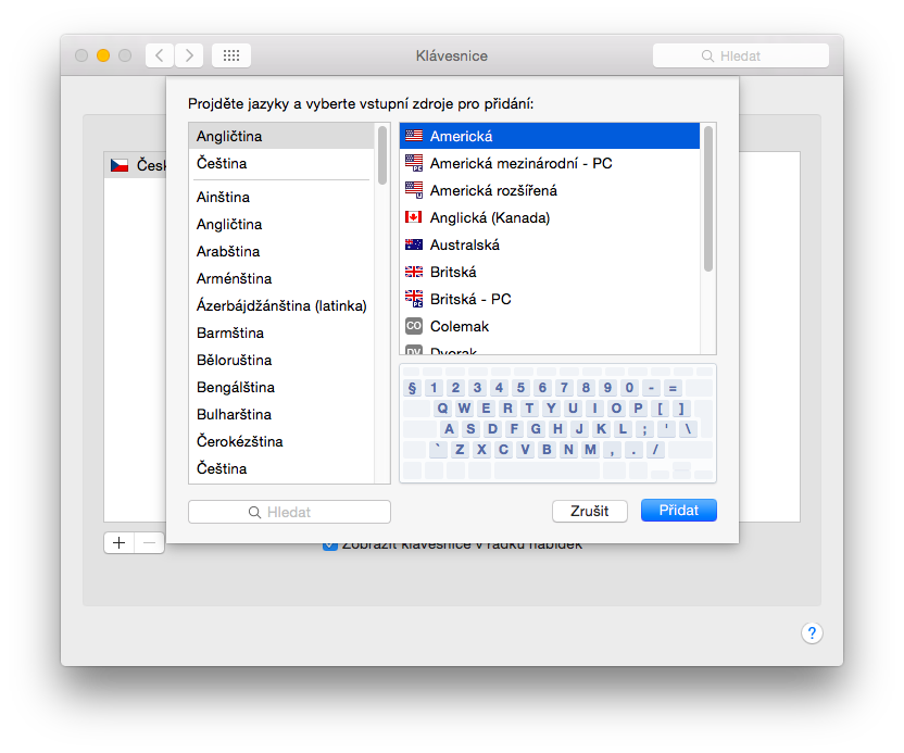 Stačí zamířit do Předvoleb systému –> Klávenice –> Vstupní zdroje a kliknout na +. Přidejte anglickou klávesnici (je jedno, jestli Britskou nebo Americkou). Poté se vraťe zpět, jděte do Klávesnice a zde zaškrtněte volbu Zobrazit prohlížeč znaků a prohlížeč klávesnice v řádku nabídek. Nyní se vám nahoru vedle hodin přidá nabídka pro přepínání jazyků klávesnic. Pokud byste chtěli používat zkratku pro přepínání mezi jazyky jako na Windows, pak návod naleznete v článku Jak na Mac OS X měnit jazyk klávesnice klávesovou zkratkou.
