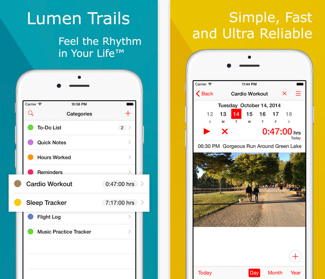 Lumen Trails Time Tracker vám umožní zapisovat si poznámky, vytvářet seznamy a sledovat všelijaké věci ve vašem životě jako např. čas, cvičení, výdaje, kalorie, váhu – prostě cokoliv co vás napadne. Kouzlo této aplikace spočívá právě v nepřeberném množství aktivit, které můžete sledovat a také v jednoduchosti a krásném designu.