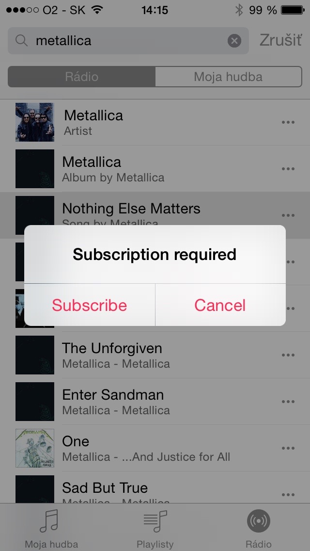 Služba však ešte nebola oficiálne spustená a preto keď stlačíte tlačidlo pre prehratie playlistu, iOS vyhodí chybovú hlášku, v ktorej uvádza, že v playliste nie je dostupná žiadna hudba. Možnosť vyhľadávania v rádiu je funkčná a zobrazuje reálne výsledky, ale neumožní vám vypočuť si ich. Inokedy sa dozviete, že pre spustenie skladby musíte mať aktívne predplatné Apple Music. Za zmienku stojí, že aplikácia vám tiež umožní vymazať nákupy s možnosťou následného obnovenia cez počítač.