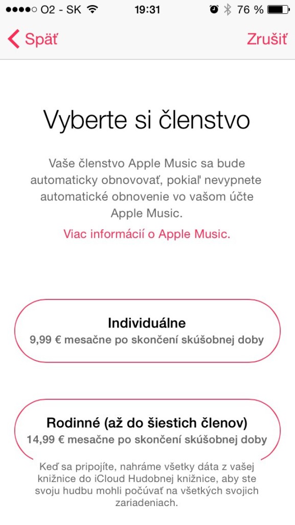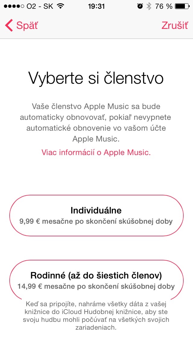 Od vydania služby Apple Music nás delia už len dva týždne a práve včera sa začali beta testerom v ČR a SR objavovať informačné hlášky, ktoré prezentujú možnosť predplatiť si službu Apple Music, prípadne si vyskúšať 3-mesačnú Trial verziu. Za zmienku stojí, že spoločnosť má podľa všetkého ponúknuť viac ako 30 miliónov skladieb a ponúka tak jednu z najväčších predplatných databáz hudby na svete, no spočiatku môže byť číslo nižšie. Podľa zdrojov blízkych Billboardu totiž Apple ešte nekontaktoval nezávislých hudobníkov, ktorí tak ešte nebudú poskytovať hudbu cez predplatnú službu.