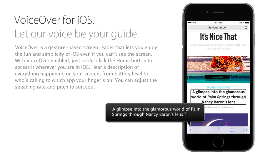 Apple zbiera ocenenia tu a tam a najnovšie získal ocenenie Helen Keller Award za to, že dokázal zmeniť život zrakovo postihnutým. Spoločnosť totiž vyvinula funkciu VoiceOver, ktorá číta to, čo sa nachádza na obrazovke alebo to, čo užívateľ stlačil, a pomáha im tak komunikovať so svetom aj napriek vážnemu zdravotnému handicapu. Funkcia je dostupná na mnohých produktoch Applu vrátane iPodu nano s dotykovým displejom.