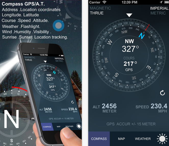 Inovativní a uživatelsky přátelská aplikace, která je velmi užitečným pomocníkem na jakékoliv cestě. Obsahuje vše, co byste mohli potřebovat v přírodě, např. kompas, který ukazuje orientaci v reálném čase, dále ukazuje současné souřadnice, kurs, rychlost a nadmořskou výšku. Aplikace dále poskytuje informace o počasí – teplota, síla větru, vlhkost, čas západu a východu slunce a viditelnost. Obsahuje také standardní, satelitní či hybridní mapy.