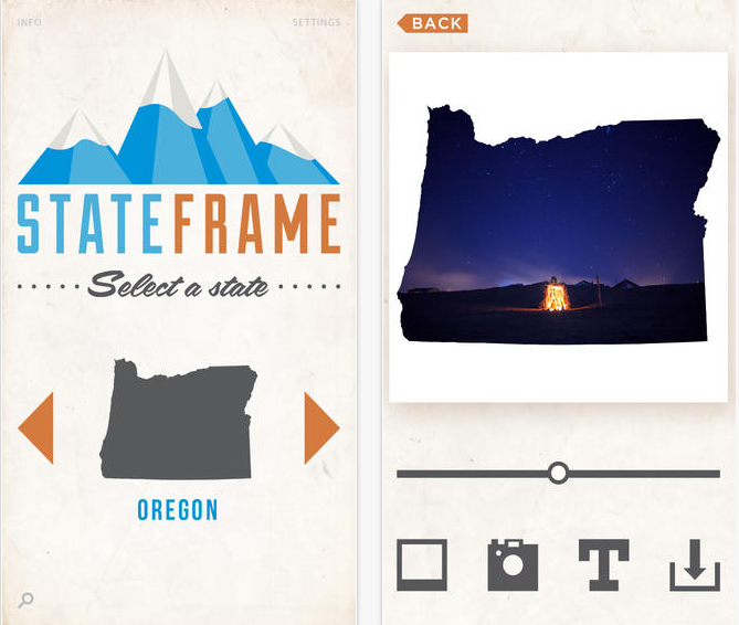 Díky aplikaci StateFrame si můžete vybrat jakýkoliv z 50 států a použít jejich tvar  státního území jako rámeček pro vaši fotografii. Sdílejte své výtvory na Facebooku či Twitteru.