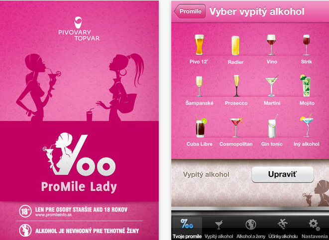 Asi každá z nás zná situaci, kdy sedí s přáteli v restauračním zařízení a vesele popíjí. Popíjíme tak dlouho, až se z veselé nálady stane zarmoucená a truchlivá. Po ruce máme vždy telefon, tak proč nenapsat bývalému nebo jeho současné nádheře (=přítelkyni)? Druhý den hořce litujeme a zapřísaháme, že se k alkoholu už nikdy nepřiblížíme.. Pokud se vám zdá tento příběh známý, tak nevěšte hlavu, jelikož by vám z těchto nesnází mohla pomoci ProMile lady. Jedná se o aplikaci, kde si nastavíte svou tělesnou váhu, druh vypitého alkoholu (nabízí až 11 druhů alkoholu a možnost nastavit si alkohol vlastní) a jak jste aktivní návštěvnicí místních lokálů. Další velmi důležitou funkcí, jejíž potřebu jsme zmiňovali výše, je nastavení blokovaných kontaktů, kterým se prostě nedovoláte/nenapíšete, dokud nevystřízlivíte (pokud máte více než 1 promile alkoholu v krvi). ProMile lady vám samozřejmě také neustále ukazuje výpočet aktuálního stavu promile v krvi a upozorní vás notifikací v momentě, kdy jste zcela střízlivé. Dále vás aplikace upozorní na věci, na které byste si měly dát pozor během popíjení, můžete se také podívat na graf vývoje vašeho stavu, zodpovědně vás upozorní na rizika pro ženy, které ve větší míře konzumují alkohol a také rizika pro těhotné ženy. Samozřejmě je důležité uvědomit si, že vstřebávání alkoholu je závislé na mnoha faktorech, takže ProMile lady je spíše orientační záležitostí.