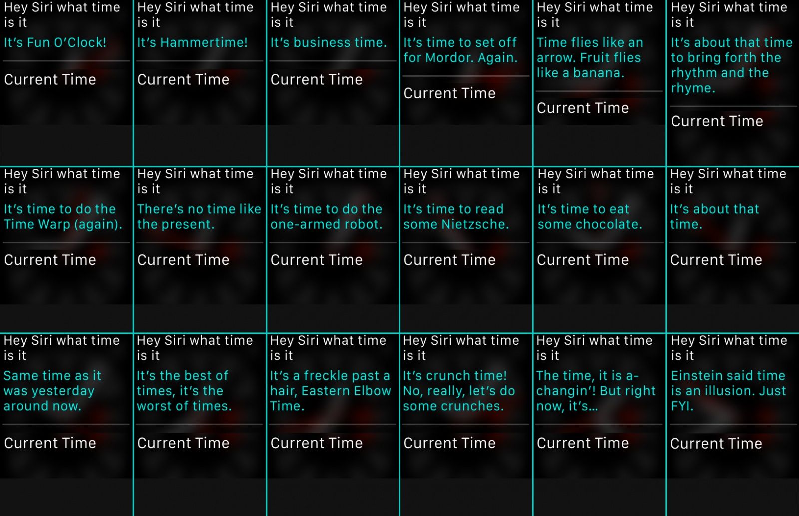Jednou z najdôležitejších funkcií Apple Watch je možnosť ukazovať čas. Napriek tomu sa ale môže stať, že sa niektorý užívateľ rozhodne opýtať Siri na hodinkách na to, koľko je práve hodín. Vývojári na to pochopiteľne mysleli a pojali to ako žart, takže keď sa náhodou opýtate svojich hodín, aký je čas, dočkáte sa naozaj zaujímavých a veľakrát vtipných odpovedí. Napríklad sa dozviete, že Einstein povedal, že čas je ilúzia. Ale keď to chcete vedieť, tak je práve 18:50.