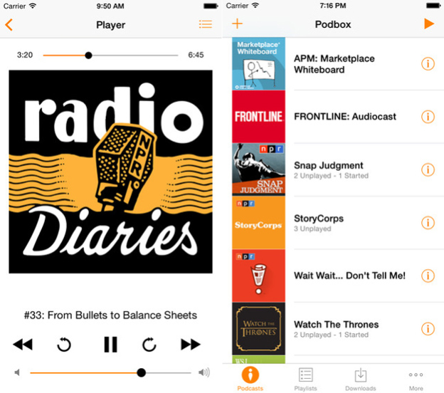 Rychlý, snadno ovladatelný a elegantní přehrávač podcastů. Aplikace umí vyhledávat tisíce podcastů zcela zdarma, stahovat podcasty do vašeho zařízení, vytvářet chytré seznamy či přehrát podcast, aniž byste ho museli přímo stahovat.