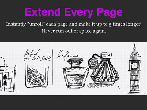 Exkluzivní aplikace na kreslení, skicování a vytváření poznámek pro váš iPad. Sketch Roll využijete na všech poradách, přednáškách či ve chvílích nudy. Každou stránku můžete 5x rozšířit pro získání dalšího místa na vaší tvorbu.