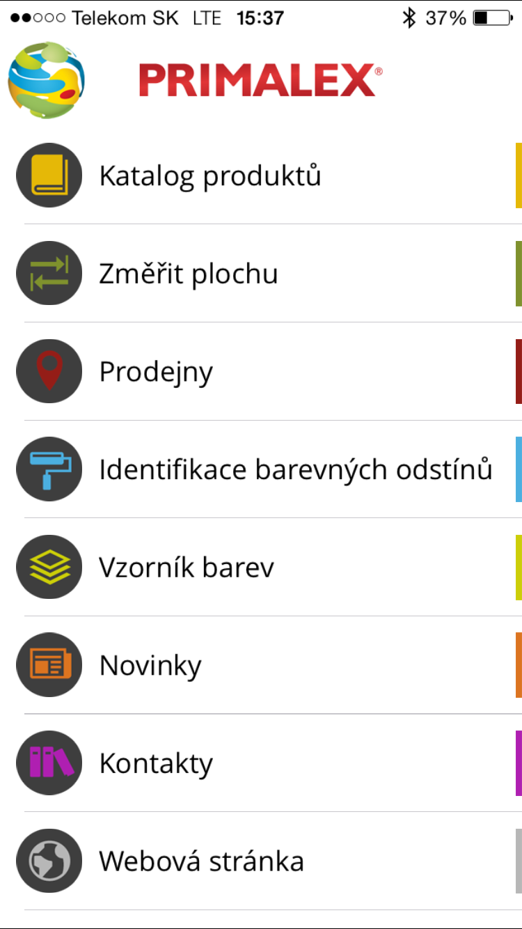 Samotná aplikace, která je zdarma, nabízí několik základních možností využití. Mezi největší vychytávky patří měření plochy kterou budeme natírat, identifikace barvy a vzorník barev. Samozřejmě se musel o všechny tyto věci někdo postarat a tak v dalších kategoriích menu najdete katalg produktů, prodejny, novinky a kontakty na společnost PRIMALEX.