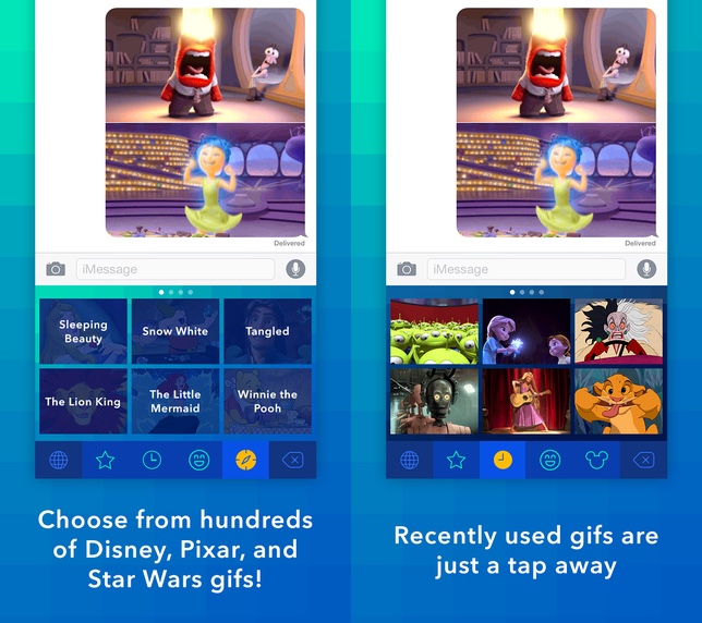Disney přichází na iPhone s vlastní klávesnicí Disney gif, jejímž cílem je snadné odesílání animovaných GIF obrázků. Těch je k dispzici více než 200 a pochopitelně nechybí ani ty nejoblíbenější loga a postavičky Disney a Pixar. Klávesnice je k dispozici zdarma v iTunes App Store přímo zde.